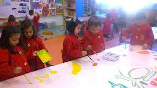 Un dos días que facemos propostas cooperativas, e de xeito organizado, mentres outros compañeiros estaban en distintos recantos, cada equipo despois de participar nunha pequeña actividade cooperativa pintamos libremente ata ir compretando o noso mural do camiño.